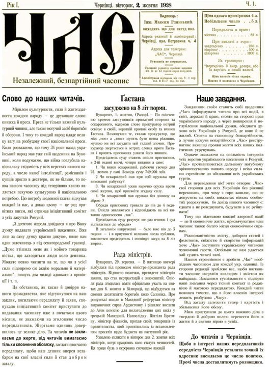 Газета «Время» появилась в Черновцах в 1928 году. Именно 2 октября был опубликован первый выпуск. С первых страниц газета отстаивала и защищала права всего украинского, в частности, языка, истории, веры и культуры. Издателем газеты «Время» был местный инженер Максим Глинский.